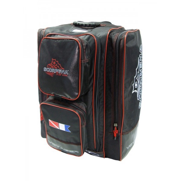 Вместительная сумка для путешествий, в которую помещается полный комплект снаряжения для дайвинга или подводной охоты и еще остается место для одежды и прочих необходимых в поездке вещей. Сумка на колесиках, с выдвижной телескопической ручкой и крупными наружными карманами.