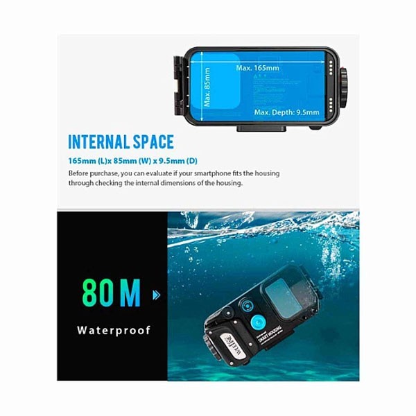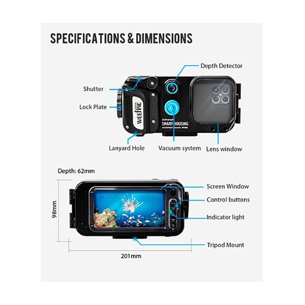 Другими словами, WEEFINE Smart Housing Pro представляет собой водонепроницаемый бокс для фото и видеосъёмки, который подходит для большинства смартфонов, если внутренний размер вашего телефона не превышает: 165 мм (длина) x 85 мм (ширина) x 9,5 мм (высота). Специальные адаптеры внутри позволят подогнать этот бокс именно под вашу модель Iphone. Прочный корпус изготовлен из алюминиевого сплава, пластика и оптического стекла. Бокс весит немного - 875 грамм и имеет нейтральную плавучесть (в зависимости от того, какая модель iPhone используется). Бокс оснащен большим рычагом затвора и кнопками управления для удобства работы даже в толстых перчатках. Вы можете регулировать масштабирование, экспозицию (EV), автоматический / ручной фокус, баланс белого, оттенок, выбор объектива, режим RAW + JPEG, Live Photo и размытие фона (на доступных моделях iPhone).
