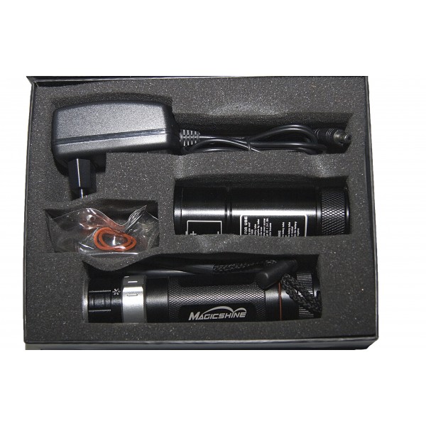 Комплект поставки?Фонарь, зарядное устройство, 2×18650 аккумулятора, 4 запасных силиконовых кольца-уплотнителя