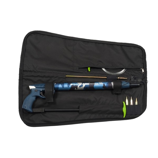 Само ружье в сумке плотно держится специальными застежками на липучках. Сумка оснащена корманами под два запасных гарпуна,карманом под насос, специальными местами для 3-х запасных наконечников и большим корманом на молнии для аксессуаров.